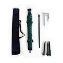 В комплекте: колышки 3 шт. для дополнительной фиксации зонта в грунте, бур для легкого вкручивания стойки зонта в землю, обеспечивающий надежную и устойчивую установку без необходимости бетонирования.